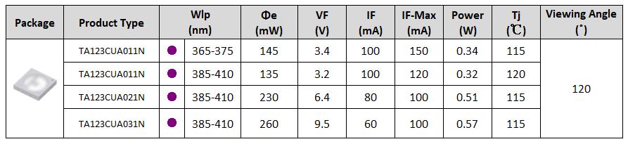 • 高光功率密度UV LED